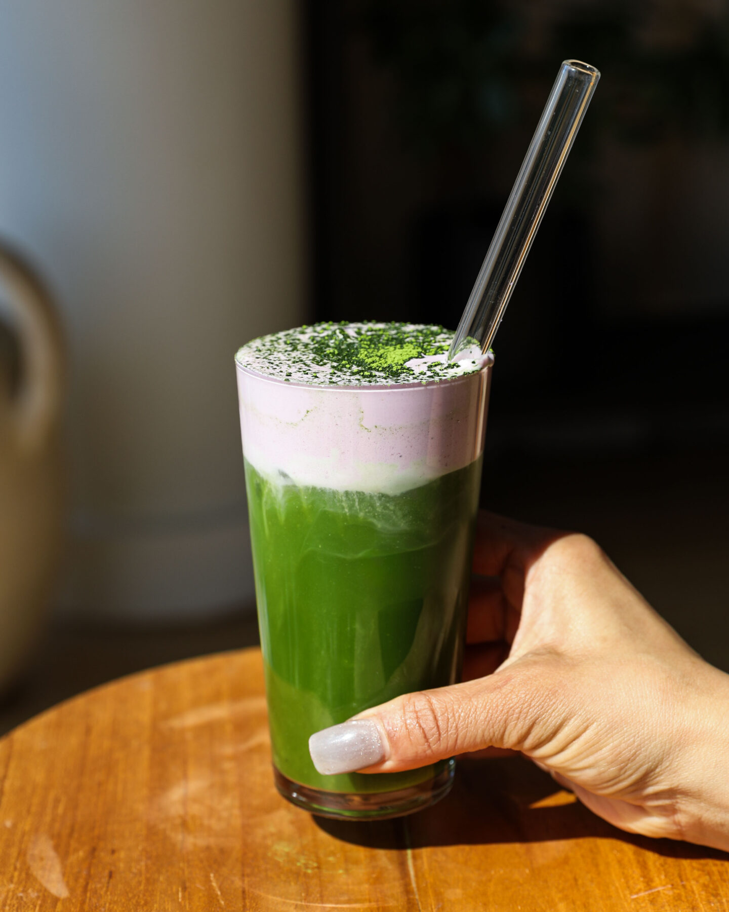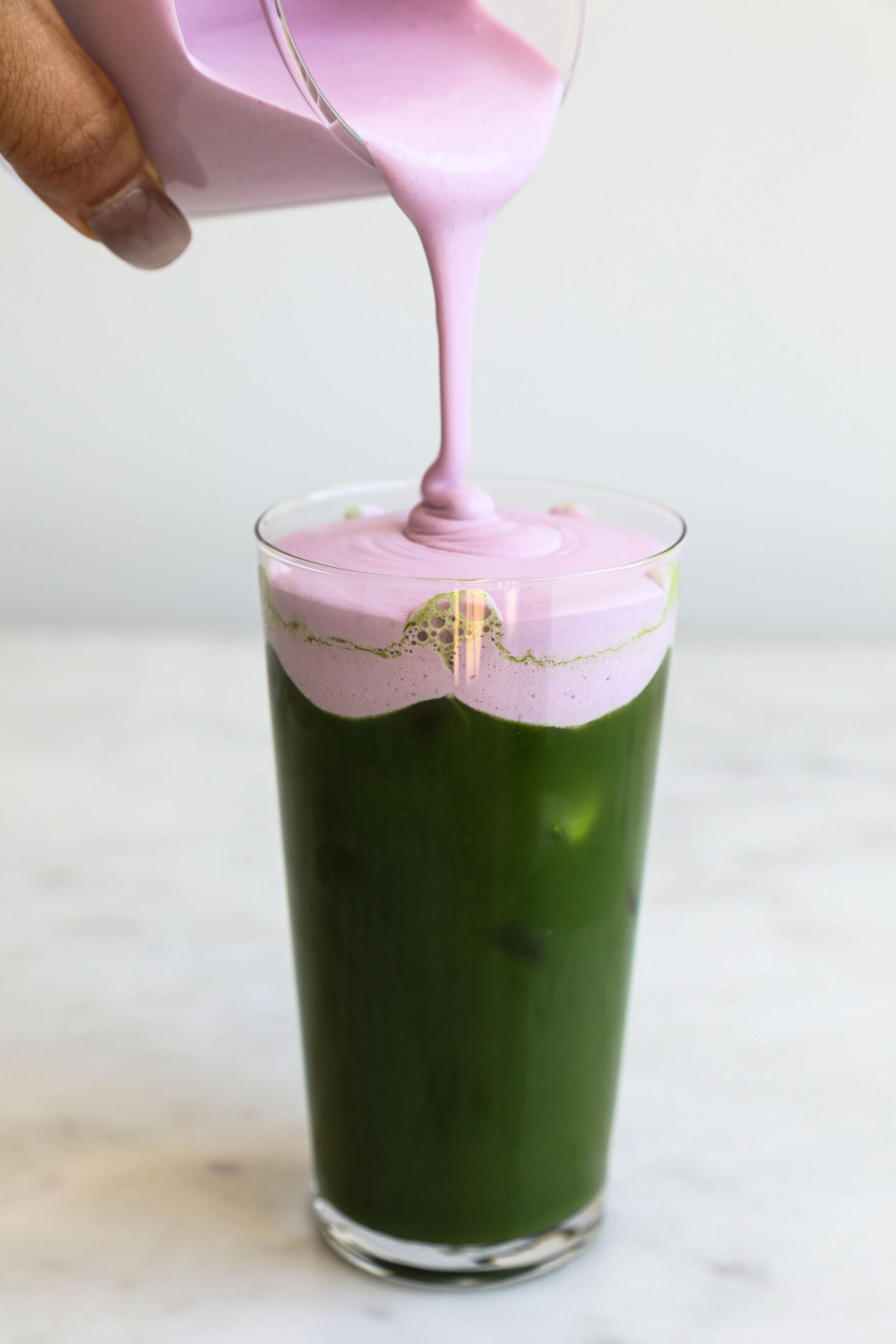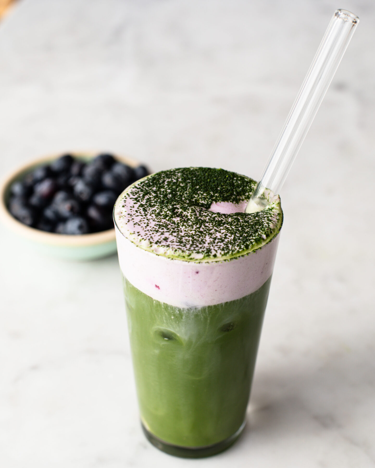 - To assemble, pour matcha into a glass (add ice if you like), then gently pour the blueberry foam over the top. Finish with a matcha powder.